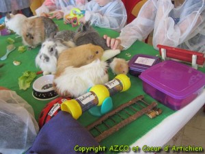 Cette position active de « prendre soin de » que l’on a l’habitude de rencontrer dans les programmes de médiation animale, prend alors tout son sens dans ce contexte hospitalier. Avec un étudiant, nous nous sommes pris au jeu, et avons parié des feuilles d’endive avec les enfants pour savoir si de Malabar ou Tagada allait gagner la course de la balançoire magique. Une bulle d’oxygène, une bulle de jeu, une bulle de vie !