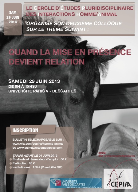 Voici une nouvelle date à noter dans votre agenda si vous êtes intéressé(e)s par la médiation animale. Pour la deuxième année, le Cercle d’Etudes Pluridisciplinaire des Interactions Homme-Animal organise un colloque autour de la relation Homme-Animal, le 29 Juin 2013 à Paris.