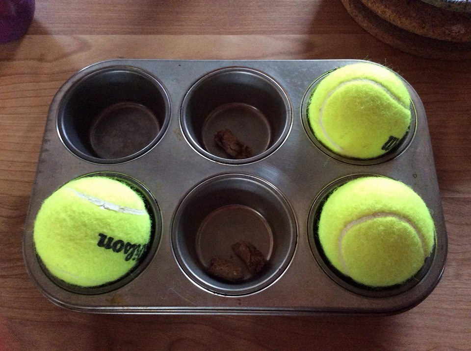 En séance, vous avez différemment moyen de l’utiliser, mais avant il faut entrainer votre chien chez vous. Vous pouvez lui apprendre le mot « cherche ». Vous cachez une friandise dans une des alvéoles et le chien doit la retrouver en soulevant déééélicatement la balle (dur dur pour certains membres de la gente canine de la maison) et en la posant par terre. Allez-y par étape. D’abord, on met une friandise sous chaque balle et petit à petit, il ne restera qu’une seule friandise pour 6 balles.