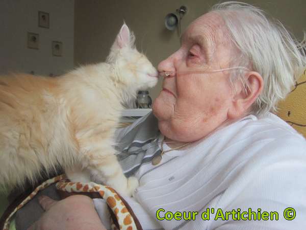 Nous lui avons également fait découvrir sa première bénéficiaire. Ceux qui nous suivent sur le groupe Facebook Coeur d’Artichien, ont pu découvrir les premières photos de ce premier pas pour Jolie dans la médiation animale. Mme L été très fière et valorisée d’être la première personne âgée que Jolie rencontrait. Jolie s’est promenée sur ses genoux, et venu lui lécher le nez, a explorer son tube à oxygène, et s’est fait caresser par les mains expertes de Mme L. Elle s’entraîne depuis plusieurs années sur le dos de Balou. Cette petite minette a su rapidement trouver sa place, et se sentir à l’aise. C’est un début prometteur.