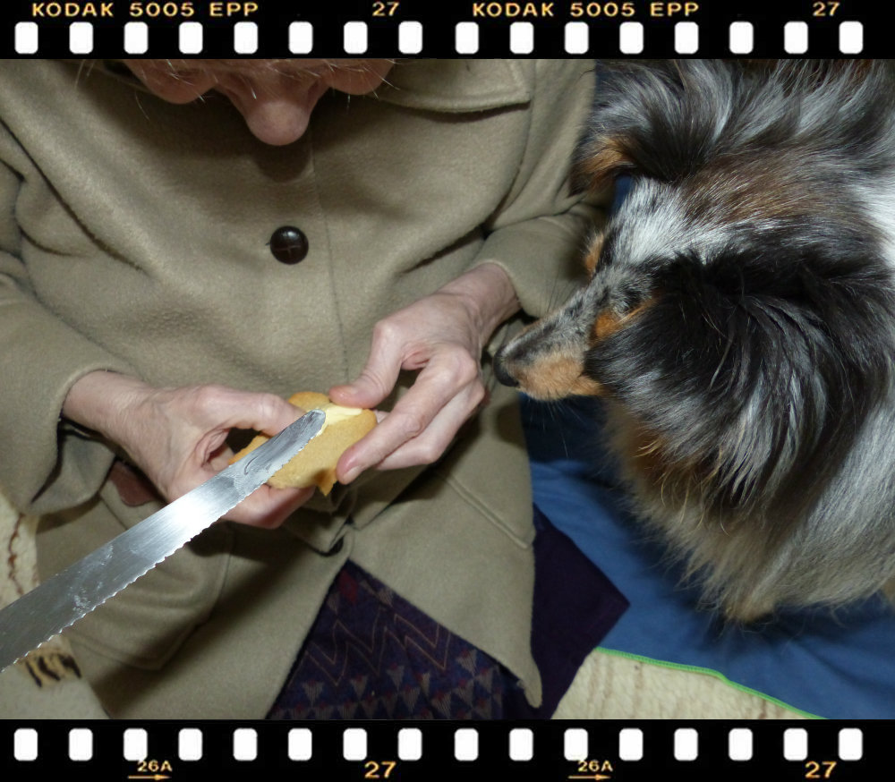 De 11h15 à 12h15 Mme G (atteinte de la maladie d’Alzheimer) nous accueille chaleureusement à son domicile. Aujourd’hui je la sens particulièrement en forme, bien ancrée à la réalité. Nous travaillons la motricité fine dans un exercice des plus difficile à 80 ans (enfait à tout âge !) : beurrer une biscotte pour Gandhi. On a bien ris, une belle complicité est née entre nous trois. C’est un espace de travail riche que nous offre la présence de Gandhi. Cela fait 1 an et demi que nous nous voyons tous les 15 jours, les résultats sont là. Mme G est bien présente durant nos séances, prend du plaisir, et nous fait remarquer quand nous sommes en retard…etonnant pour une personne avec des troubles de la mémoire, non ? En fin de séance Mme G n’a pas du tout envie que je parte. Si je m’écoutais je resterais avec elle, mais je crois que nos séances de travail perdrais du sens si je m’éternisais.