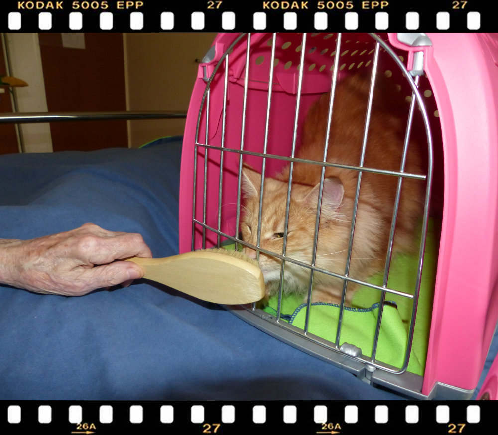 14h40 En traversant la résidence 2 ou 3 professionnels m’arrêtent pour me demander qui est dans cette jolie boite rose ? Je leur présente rapidement Jolie, j’entends des « oh mais qu’elle est belle ». J’arrive enfin à la chambre de Mme A, son visage s’illumine à la vue de la boite de transport rose. La séance se tourne vers « la toilette de Jolie » et le plaisir, « l’égoisme » que manifeste Jolie en osant s’occuper d’elle plutôt que Mme A. Quelques exercices de motricité avec le plumeau, mais surtout beaucoup de plaisir et de communication verbale se partage dans cette séance sous le signe de l’écoute. Mme A, reste très cohérente durant 45 minutes. Elle a le sourire. C’est une dame qui me touche. Je ressens des émotions (et heureusement !), j’apprends à faire avec, à les accueillir et à les gérer. J’ai appris cela avec mes 6 années d’expérience. Quand on fait plusieurs séance dans une journée, il est important d’être vigilent sur cette question, de façon à ce qu’une séance n’impacte celle qui suit derrière. Ce n’est pas toujours évident, déjà d’en avoir conscience, ça aide.