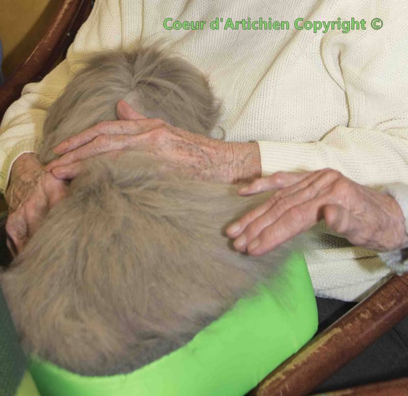 14h25 – L’animatrice porteuse de projet et l’équipe sont chamboulées, par le comportement Mme M. « Il n’y a que les chiennes pour l’apaiser » me dit-on. Je la vois en individuel. Elle est assise dans son fauteuil, un vêtement jeté à la hâte sur elle. Elle accueille les chiennes avec un mélange de joie et de grande souffrance. L’ambiance est lourde. J’écarte un instant Jenna pour la protéger, Haven étant plus expérimentée. La vieille dame revient peu à peu à la réalité. Elle caresse, embrasse, et se confie aux longues oreilles des chiennes. Elle exprime des douleurs à l’abdomen, est fatiguée, elle désire s’en aller. 15 mn se sont écoulées, nous sommes épuisées ! La fameuse qualité de présence…