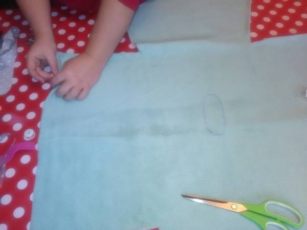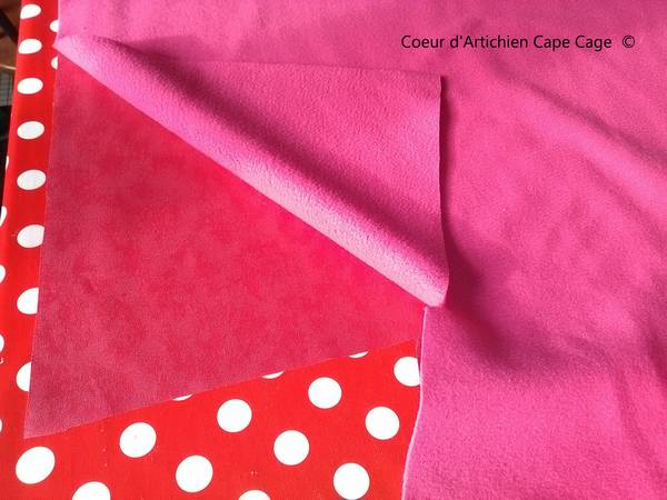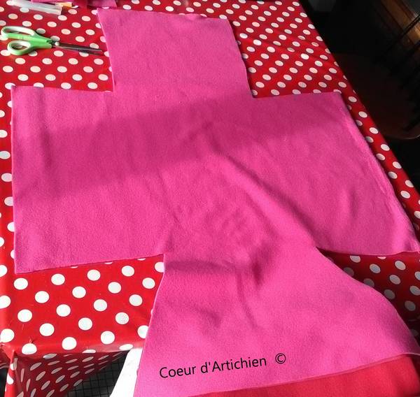 - Superposer les deux tissus le côté « endroit » du coton sur la table, le côté « envers » sur la polaire.